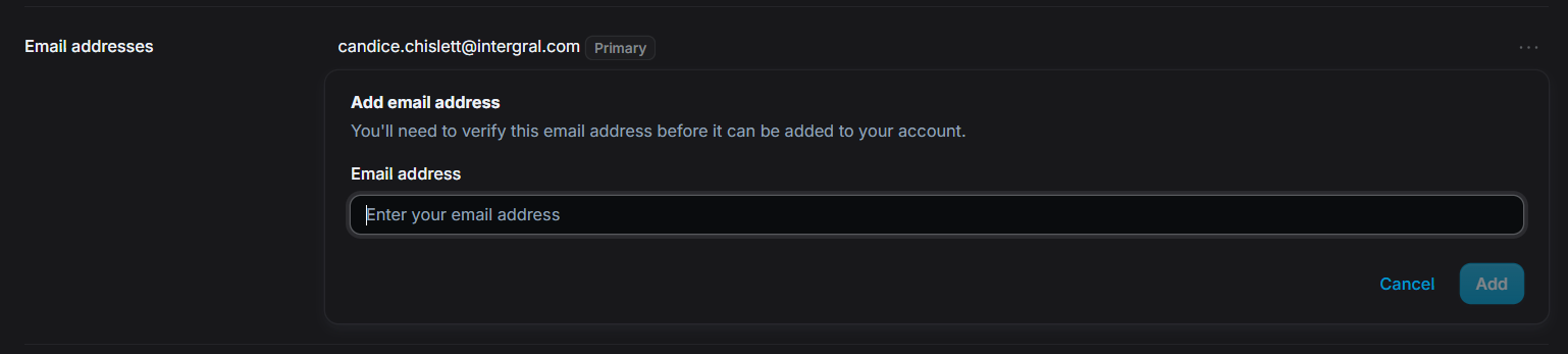 Click + Add email address, enter the new address, then click Add. You will receive a verification email before the address is officially added to your account.