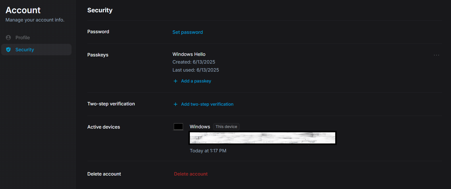 The User Security page lets you manage the security settings for your account, including your password, passkeys, and two-step verification.