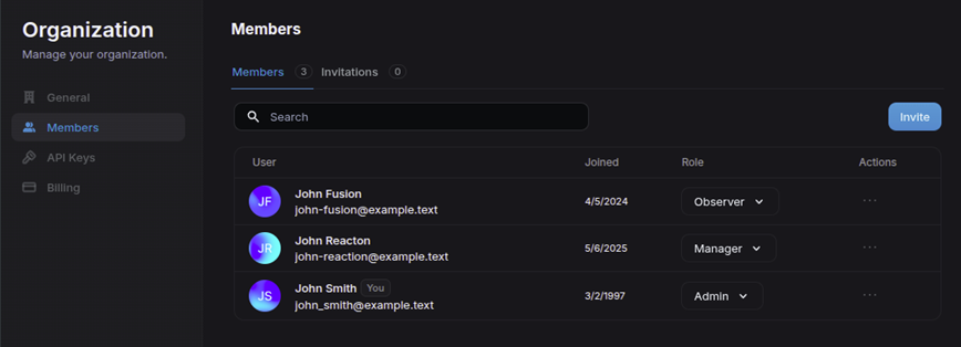 The Organization Users page lets you view and manage all members of your organization, assign roles, and invite new users.