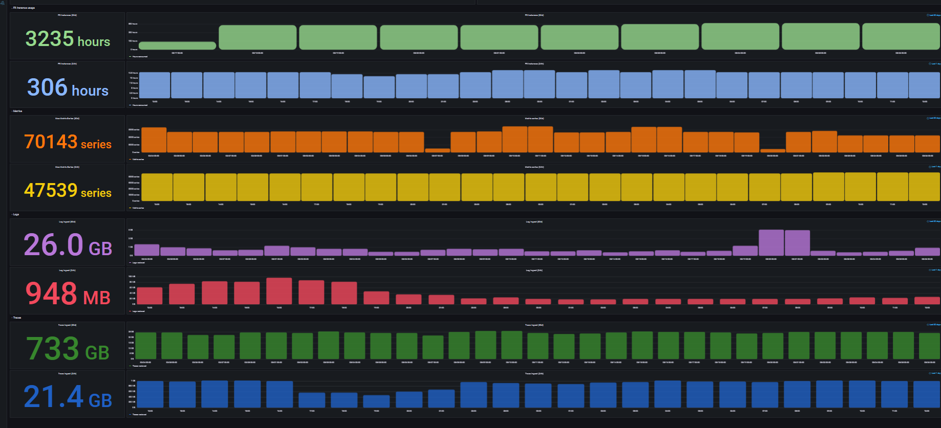 For example, the above graphic indicates that 733 GB of traces have been ingested over the 30 day period. The figure below that of 21.4GB shows the number of traces ingested in the last 24 hours.