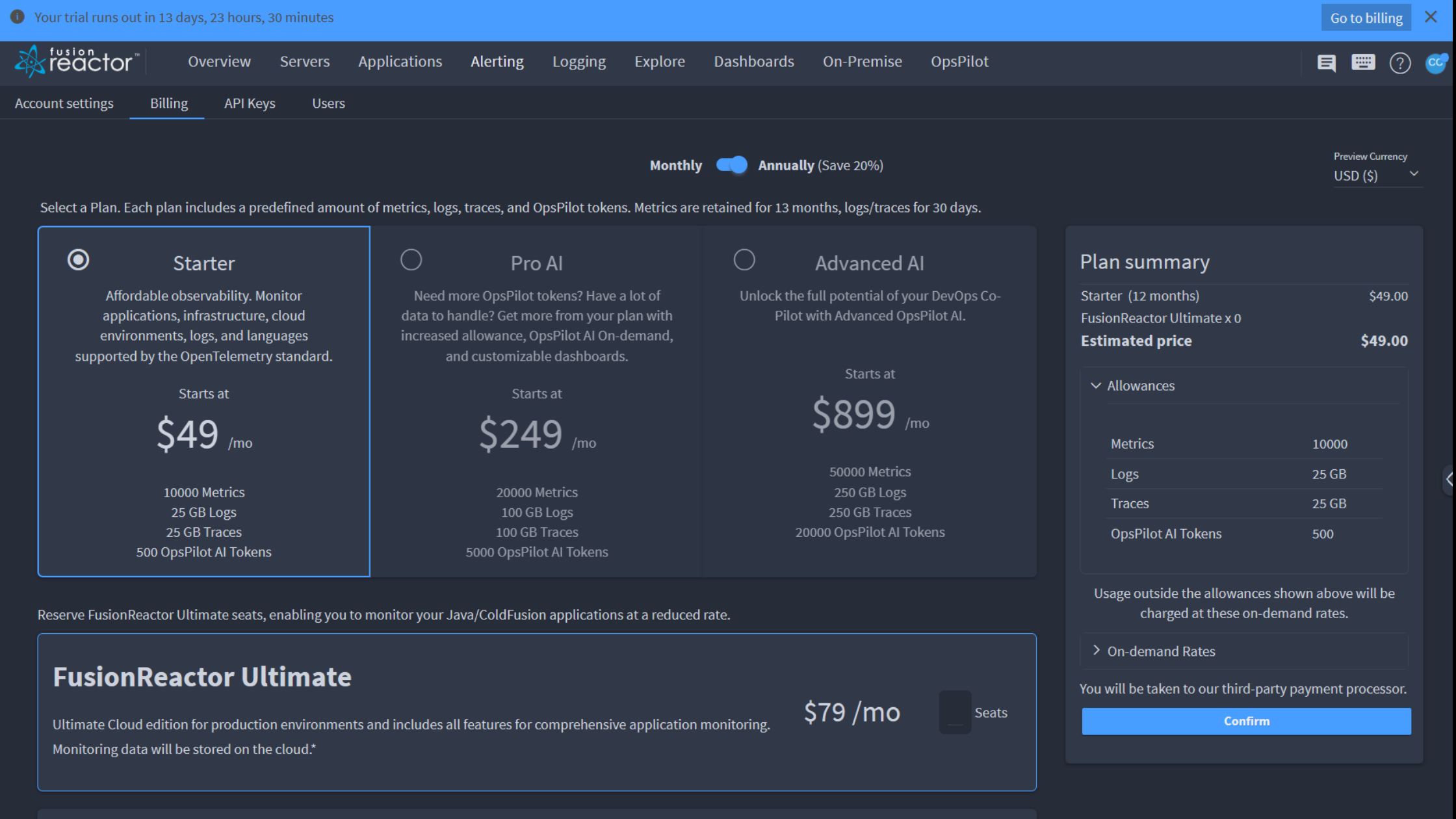 To effectively manage costs, a customer can optionally reserve a FusionReactor Ultimate seat for $79 billed monthly with an annual commitment or $95 billed monthly with no commitment. Each seat gives the user 750 hours of FusionReactor usage and includes 2GB logs, 5000 metrics and 2GB traces to cover the average usage from FusionReactor. This acts as a buffer to prevent most existing customers from entering the usage-based billing.